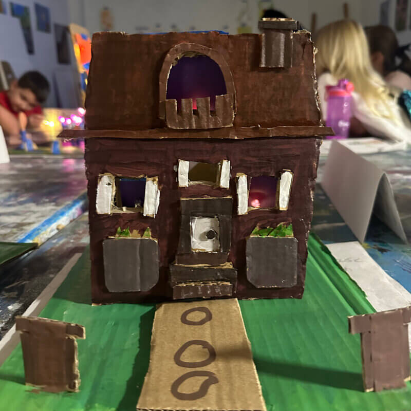 Create your own sculptural Haunted House with cardboard and other materials. Light up the windows and lawn with the help of fairy lights!